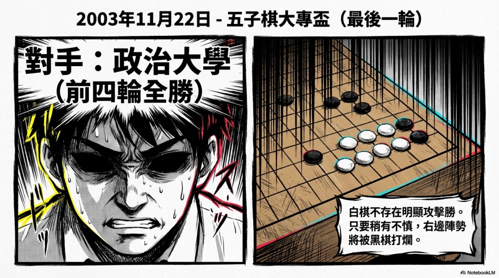 還記得2003年11月22日,台灣唯一一屆五子棋大專盃的最後一輪,我們對到了當時前四輪保持全勝的政治大學。