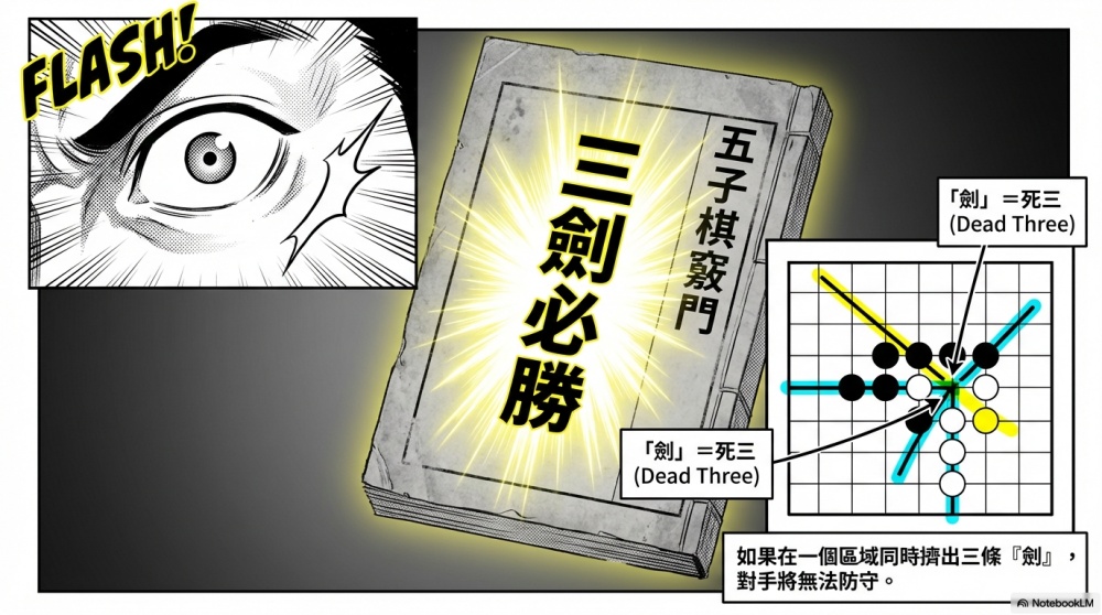 「三劍必勝」的意思是,如果你能在棋盤的某一個區塊,同時擠出三條以上的「劍」的話,就很容易營造出一個局部上無法防守的必勝態勢。