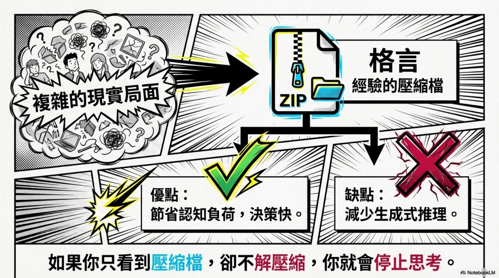人腦喜歡節省認知負荷,格言則提供了快速決策線索,短期很有效,但長久下來,容易減少學習者的探索性思維與生成式推理。