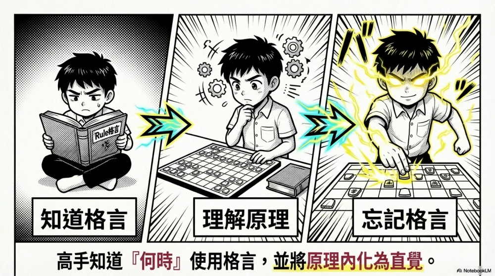 真正的突破,是從「知道格言」到「理解格言背後的原理」再到「忘記格言(讓原理自動化)」,這個過程是蛻變成高手前的必經之路。
