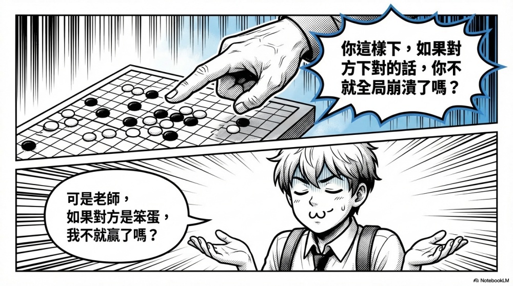 「你這一步,是不是假設對方會下錯?」等學員給予正面的回應後,我會馬上追問「如果對方下對,你的局面會變得如何?」