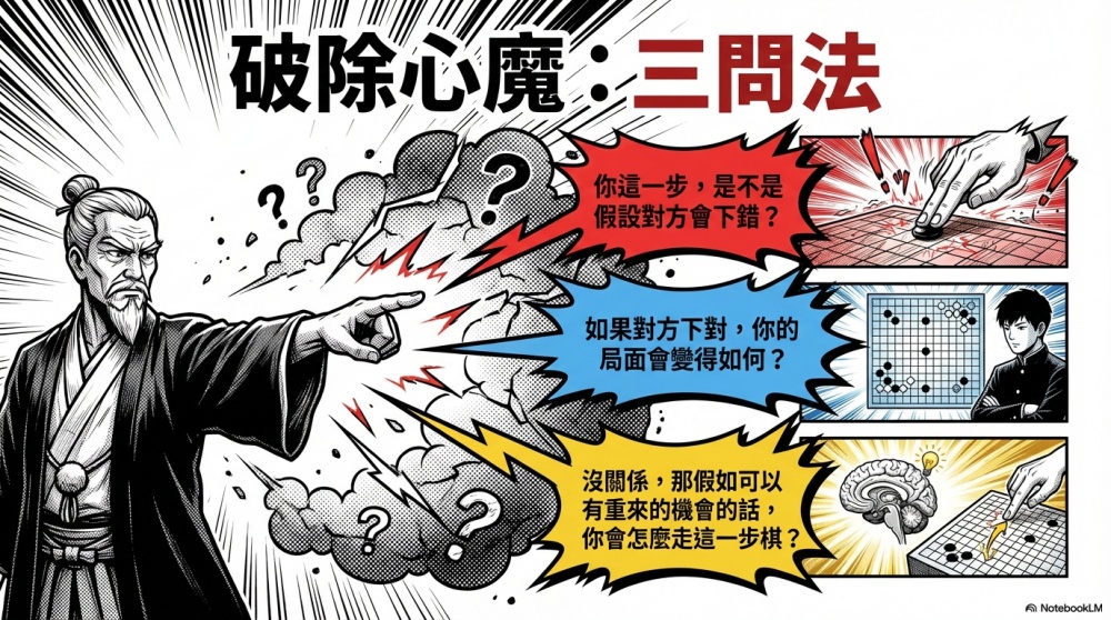 我在上課時,會趁著與學員進行覆盤的時候,刻意挑出學員因為“先假設對方會下錯”,而走得不太好的那幾步棋,並且連續問他三個問題。