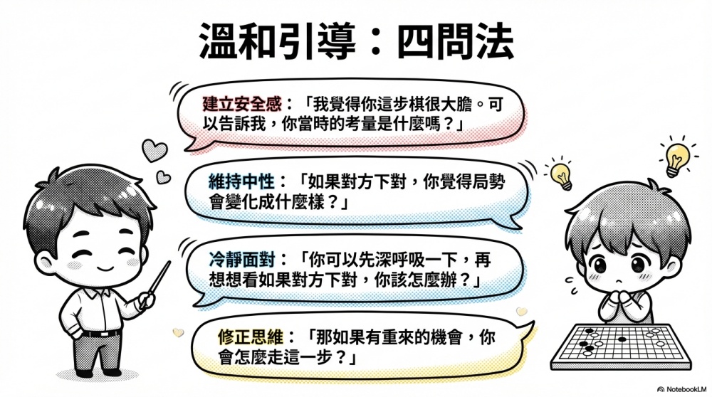 ˙「我覺得你這步棋很大膽,很有想法。可以告訴我,你當時的考量是什麼嗎?」→先建立安全感