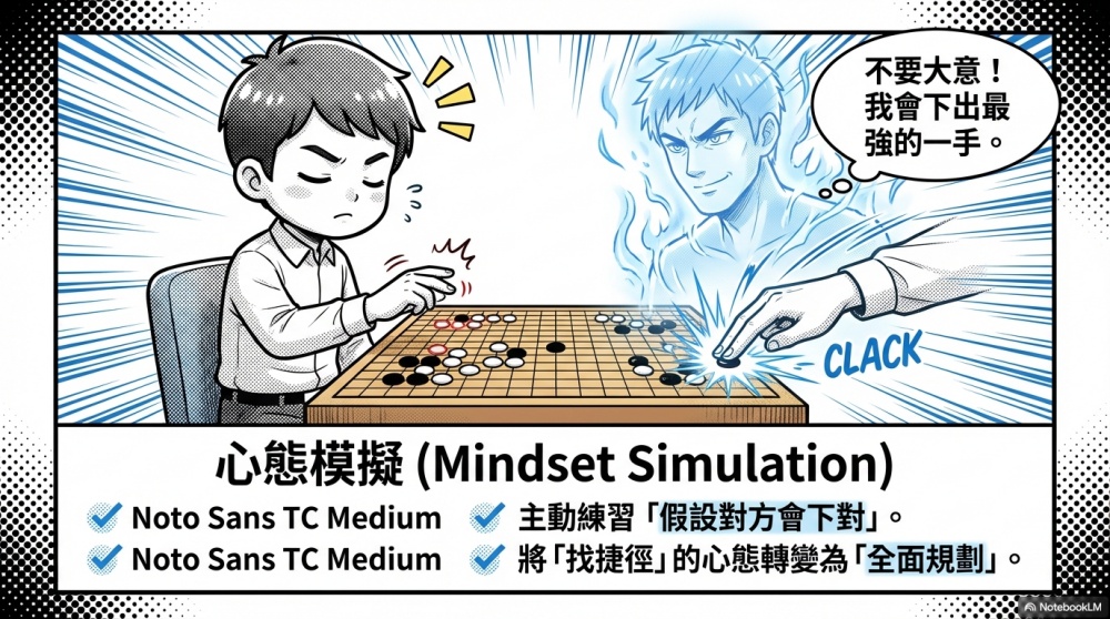 我認為,脫離固化行為的方法,除了不假設對方會下錯外,更重要的是主動練習「假設對方會下對」。這需要訓練棋友的「心態模擬」能力,即在每一步棋之前,強迫自己預測對手所下的每一步棋都是對的。這從根本上改變了他們的思考習慣,將「找捷徑」的心態轉變為「全面規劃」的心態。