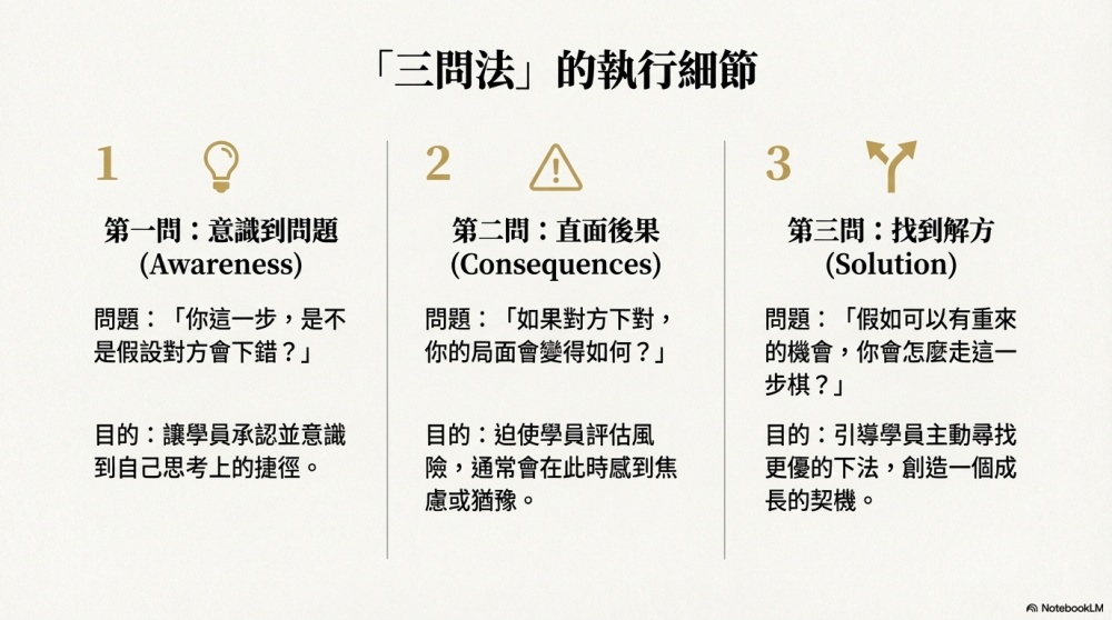 我在上課時,會趁著與學員進行覆盤的時候,刻意挑出學員因為“先假設對方會下錯”,而走得不太好的那幾步棋,並且連續問他三個問題。