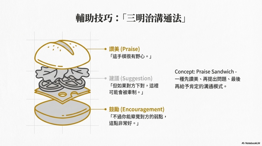 ˙「我覺得你這步棋很大膽,很有想法。可以告訴我,你當時的考量是什麼嗎?」→先建立安全感