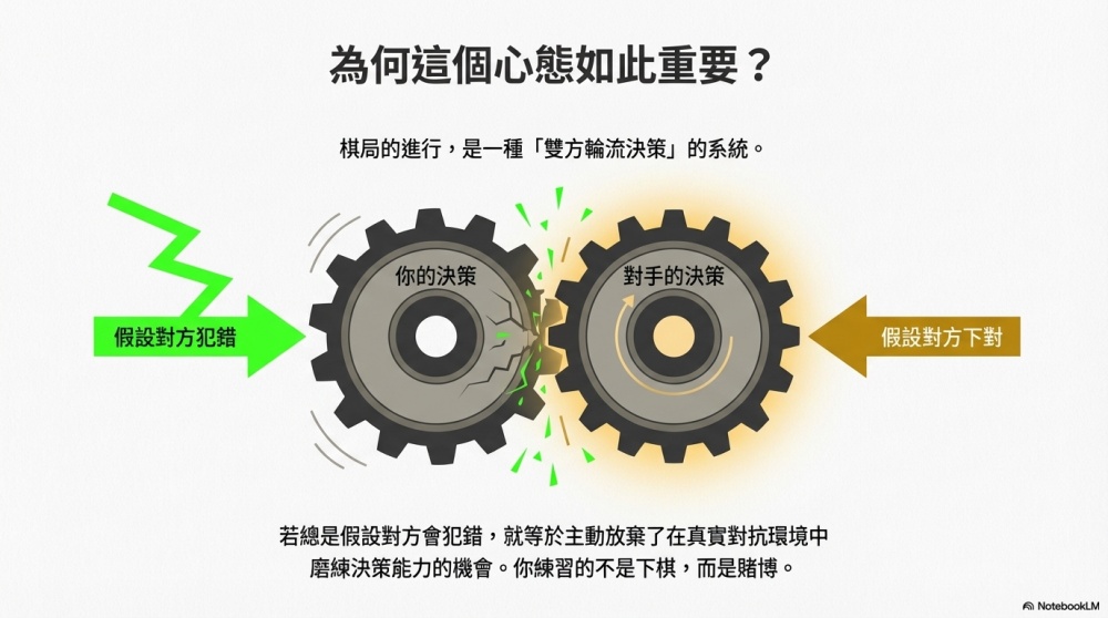 我們可以把棋局的進行,看成是一種「雙方輪流決策」的系統,若下棋時常常喜歡假設對方會犯錯,而讓你簡單獲勝,就等於放棄面對現實的對抗環境。