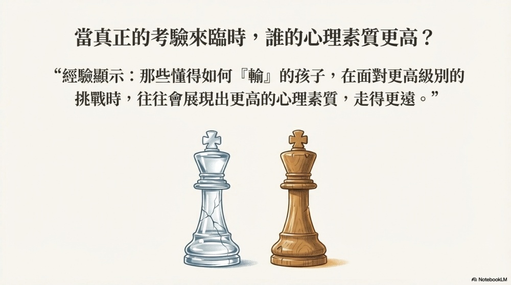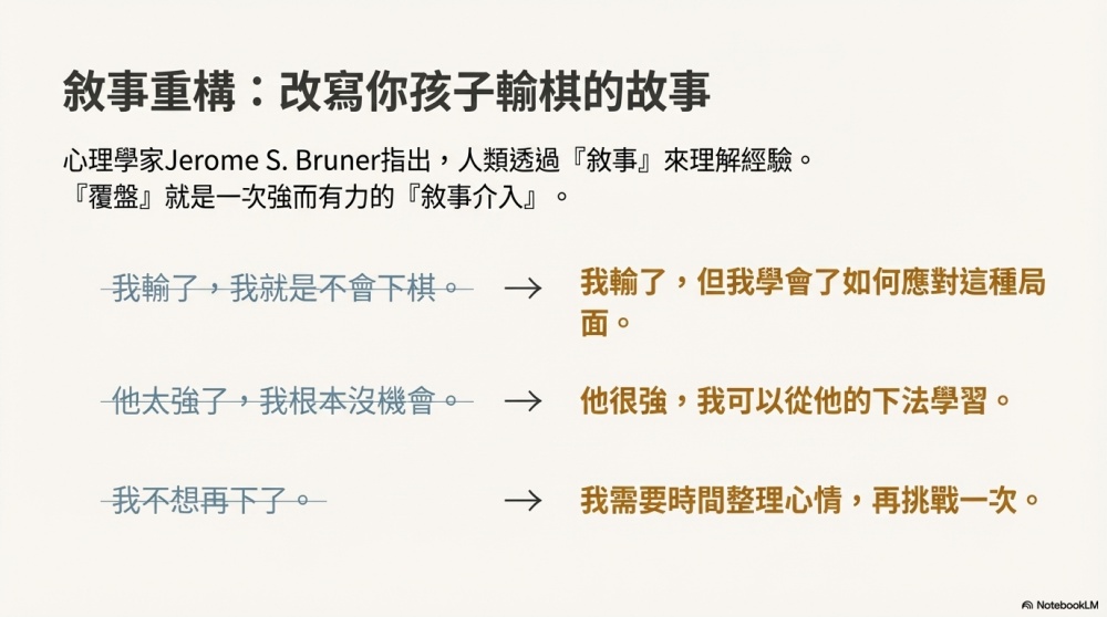 「敘事介入」的方式,讓每一次的覆盤不只是技術分析,更是敘事重構的機會。孩子如何看待自己輸棋的敘事,將決定日後他如何看待自己。