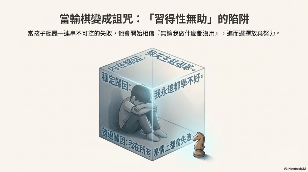 習得性無助指的是當個體經歷了一連串不可控的負面事件後,即使新的情境是可控的,他也會選擇放棄努力,相信「無論我做什麼都沒用」。這讓孩子將失敗歸因於內在、穩定、且普遍的因素(如:「我天生就很笨」、「我永遠都學不好」)。
