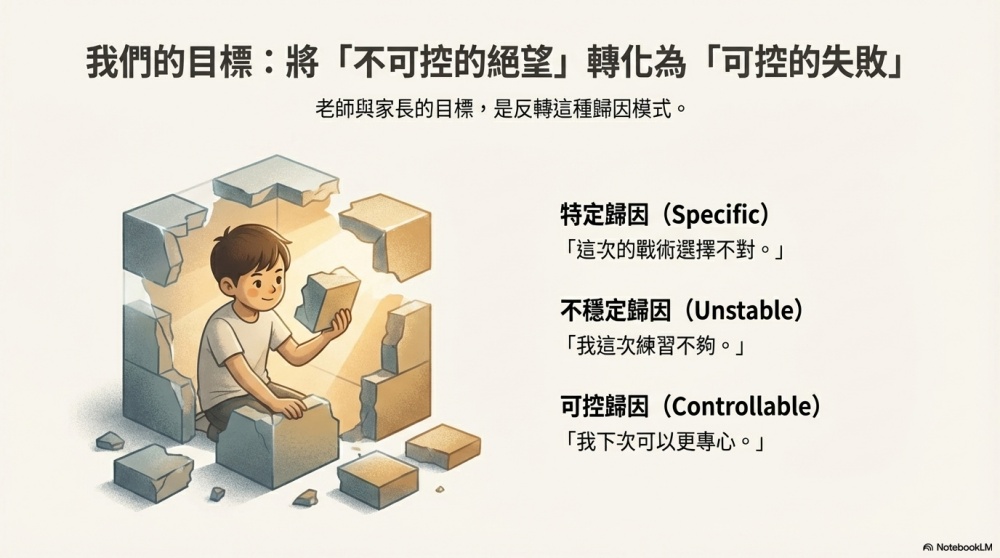 所以,老師的目標是反轉這種歸因。通過「可控的失敗」,讓孩子將失敗歸因於外在、不穩定、且特定的因素。例如「這盤棋我太急躁了」、「這次的戰術選擇不對」、「我練習不夠」。
