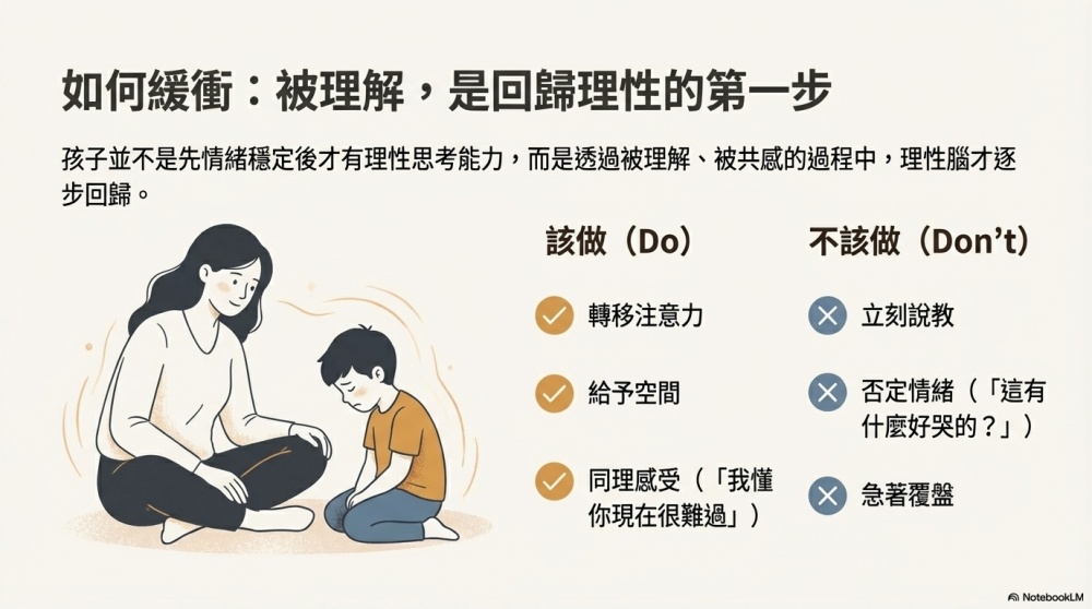 孩子並不是先情緒穩定後,才有理性思考能力,而是透過被理解、被共感的過程中,理性腦才逐步回歸。