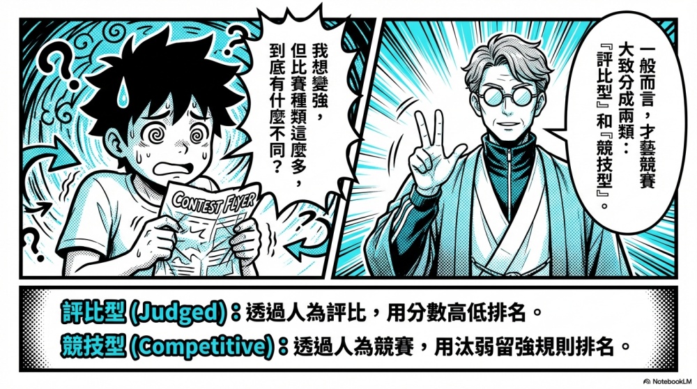 一般而言,才藝競賽可以大致上分成「評比型」和「競技型」。