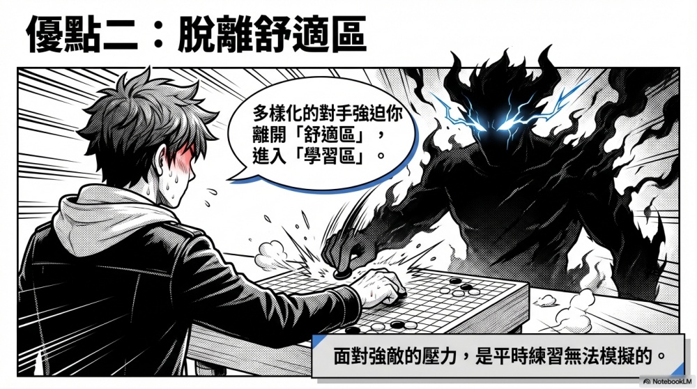 二、比賽提供了多樣化的對手與情境,能有效強迫選手脫離「舒適區」而進入「學習區」