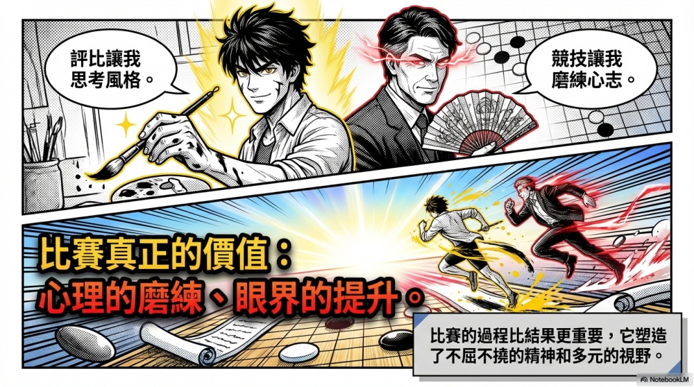 競技型比賽提供明確勝負與挑戰感,是技藝快速提升的催化劑,但給參與者提供的心理壓力較大,需要介入一定程度的心態調適。