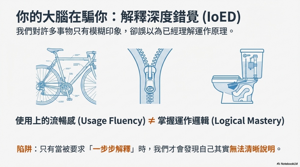 「解釋深度錯覺」指的是,在日常生活中,我們對許多事物其實只有模糊印象,卻很容易誤以為自己已經理解了它的運作原理。