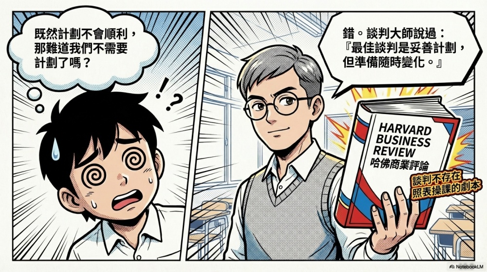 【哈佛商業評論】網站裡面,有一篇名為「最佳談判:妥善計劃、但準備隨時變化」的文章指出,談判本身不存在照表操課的劇本,我們需要事先擬好策略,再依據當時的狀況臨機應變。