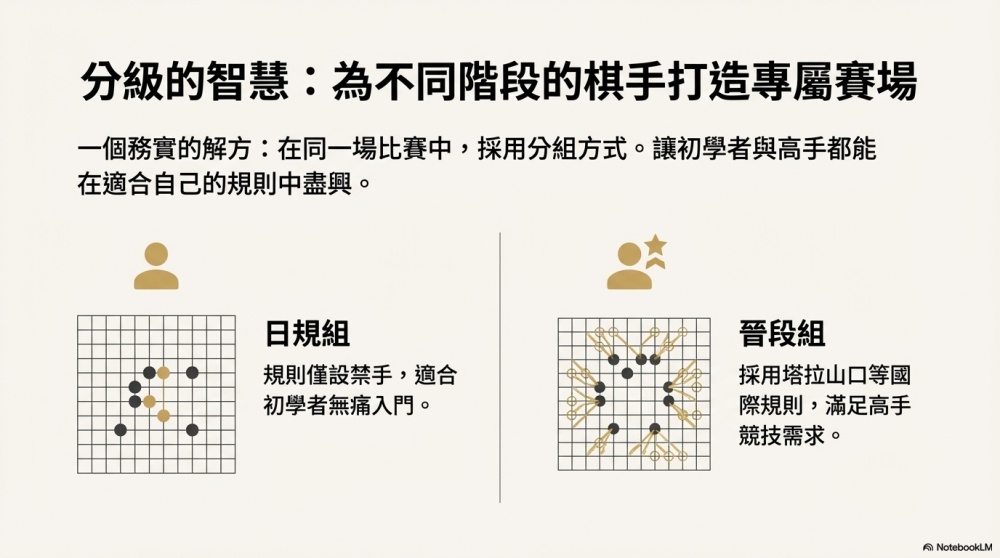 讓初學者可以用比較無痛的方式參加比賽,而已經有點程度的棋友,也同樣可以在正式規則的組別中下得很盡興。