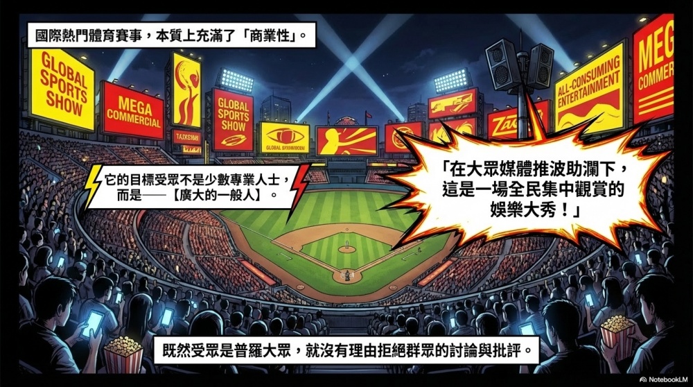 我自己的看法是,國際熱門體育賽事本身就充滿了商業性,除了給少數專業的人士欣賞以外,它的目標受眾本來就是廣大的一般人。