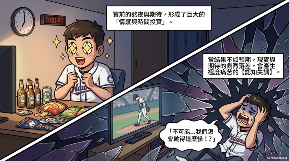 大眾在賽前通常會投入極大的情感與時間成本(例如熬夜看球),這在心理上形成了一種預期投資。
