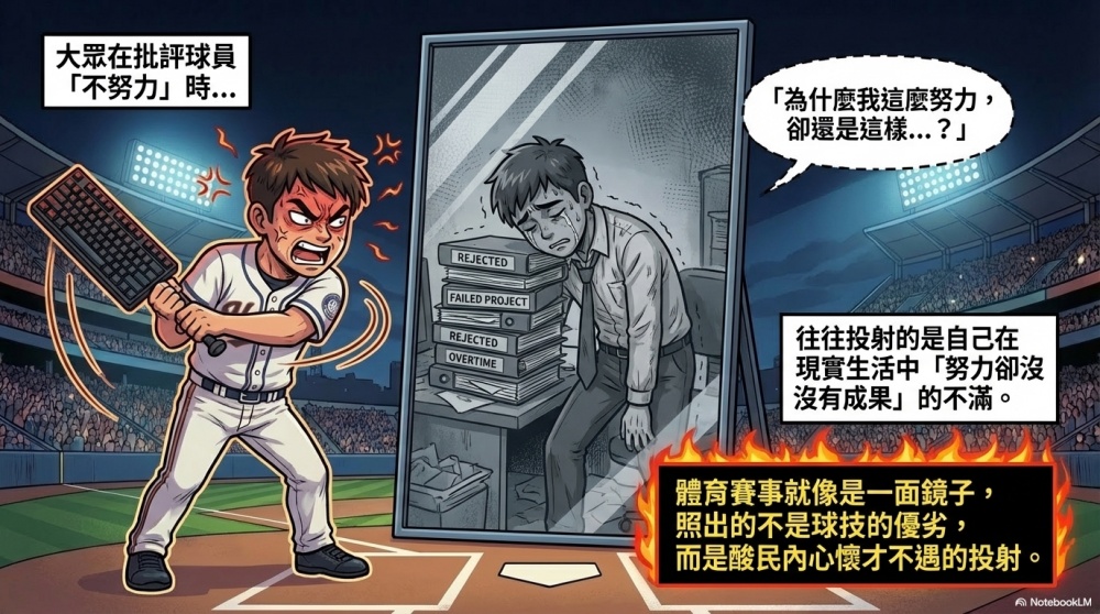 大眾在批評球員「不努力」時,往往投射的是自己在現實生活中自以為「努力卻沒有成果」所帶來的不滿。