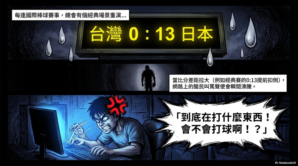 比如像是幾天前的棒球經典賽,當台灣被日本隊以13︰0的差距提前扣倒後,網路上充斥一片酸民們的叫罵。