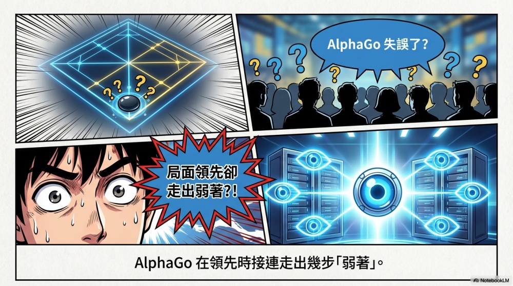 還記得人機大戰的第一盤後半段,AlphaGo在局面領先的情況下,接連走出了幾步弱著。