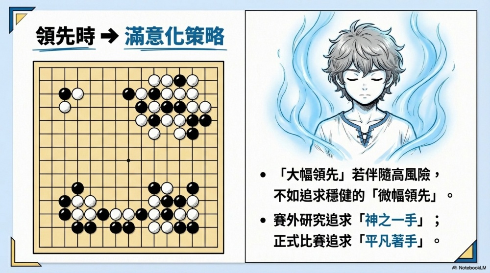 而「確保能贏的下法」,則屬於「滿意化策略」,也就是只要能穩定維持優勢、守住勝率門檻,就不再冒不必要的風險。