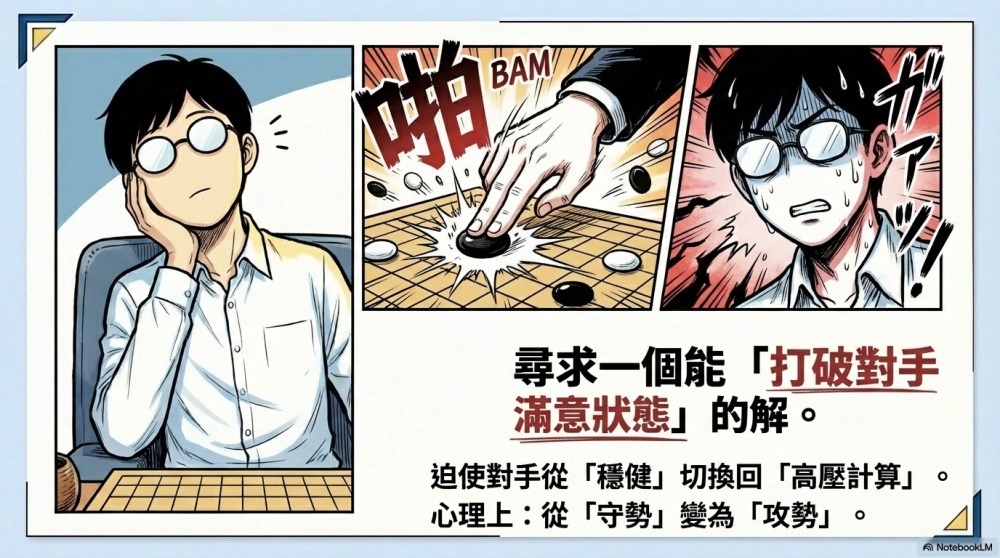 這個時候,你將不再採用「足夠滿意」的解,而是尋求一個能打破對手滿意狀態的解。