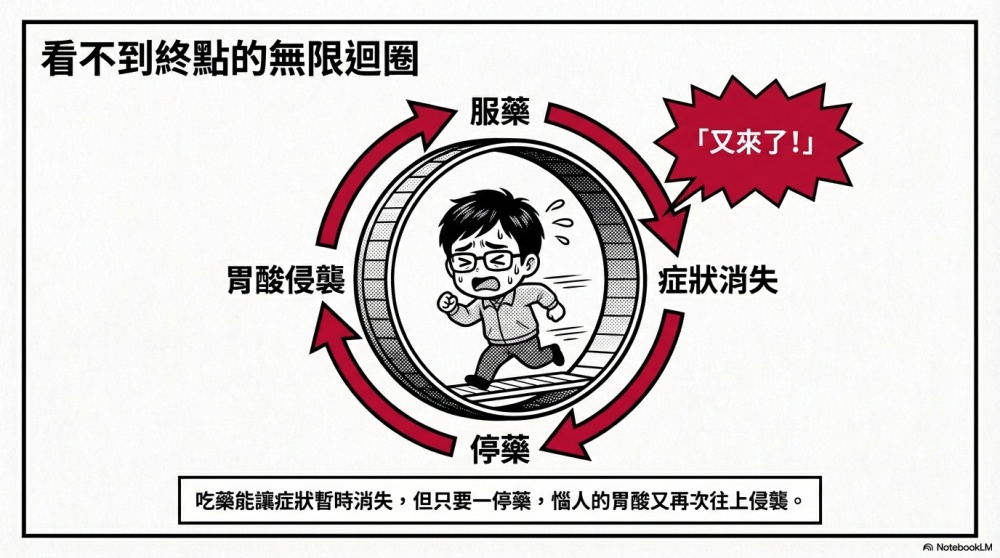 接下來的演變,就跟許多同樣患有胃酸逆流的病友們一樣,吃藥能讓症狀暫時消失一陣子,但只要一停藥,惱人的胃酸又再次往上侵襲,成了一種看不到終點的無限迴圈。