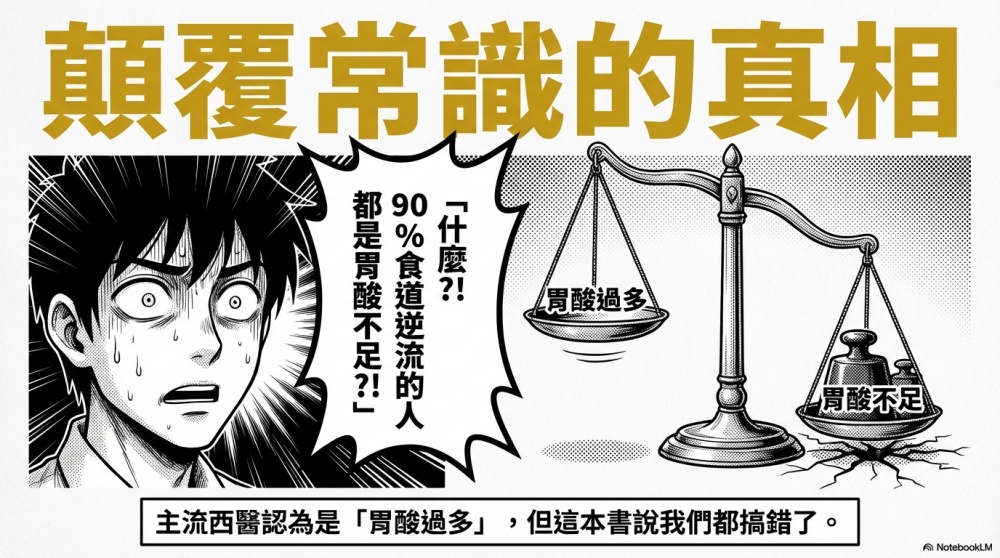但他在書裡面提出的觀點,卻是相當的反常識,就如同封面副標題寫的那樣–「90%胃食道逆流的人都胃酸不足」!?
