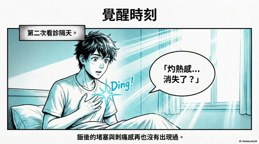 第二次看診完的隔天,醒來後我就很清楚地發現,造成胸口灼熱的逆流感消失了。